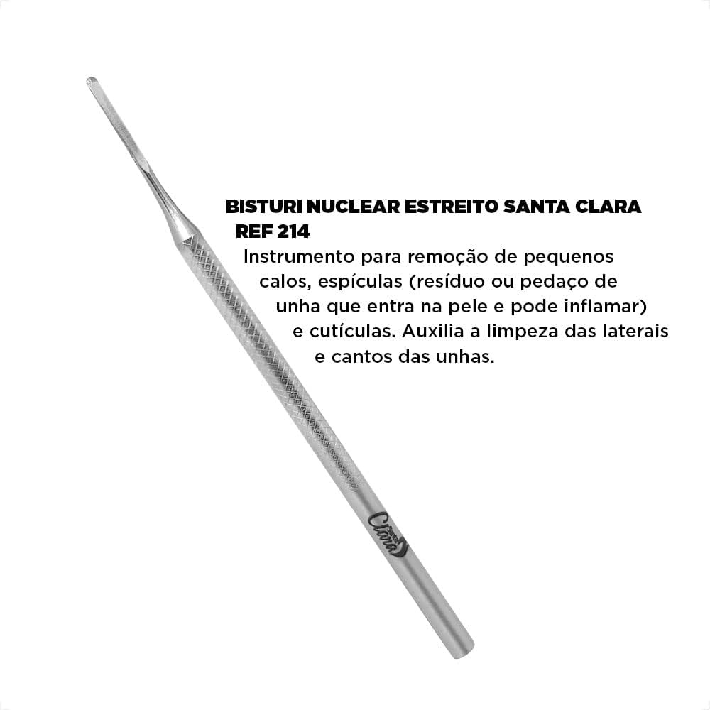 Este Bisturi é o Bisturi Nuclear Largo ref. 214 - Indicado para desencravar a unha, tratar espícula e remover a pele. Composição: 100% Aço Inox. Produto não perecível. Validade indeterminada.