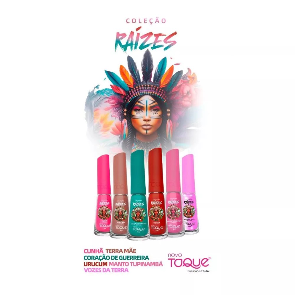 A Coleção Raízes nasceu da inspiração rica e diversificada da cultura indígena. Ela celebra as raízes que ajudaram a definir as origens da nossa nação. Com seis cores, cada esmalte homenageia um elemento essencial dessa herança cultural. Manto Tupinambá uma cor que representa o símbolo da memória e da resistência do povo Tupinambá. Vozes da Terra traz um tom que conecta você com a sabedoria ancestral que ecoa através dos tempos. Terra Mãe vem com um marrom terroso simbolizando a fertilidade da natureza que nutre a vida. Cunhã um rosa vibrante que celebra a feminilidade e a importância das mulheres na cultura indígena. Urucum chega com um vermelho inspirado no pigmento natural usado pelos povos indígenas para marcar sua identidade. Coração de Guerreira apresenta uma nuance marcante que representa a coragem e a força inabalável das guerreiras indígenas. Essas cores não representam apenas uma homenagem à cultura indígena e toda sua importância em nossa ancestralidade, mas também é um convite para que cada mulher se conecte com suas próprias raízes e explore a beleza que vem do seu interior.