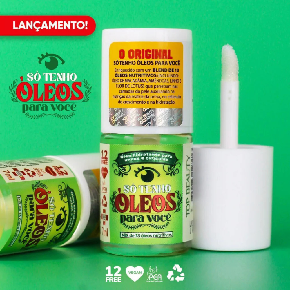 Só Tenho Óleo para Você é o novo produto da Top Beauty! Mix de 13 óleos nutritivos e hidratantes para unhas e cutículas. Enriquecido com um Blend de 13 óleos (inclucindo óleo de macadâmia, amêndoas, linho e flor de lótus), que penetram nas camadas da pele auxiliando na nutrição da matriz da unha, no estímulo do crescimento e na hidratação. Contém fragrância de menta. Fórmula 12free!