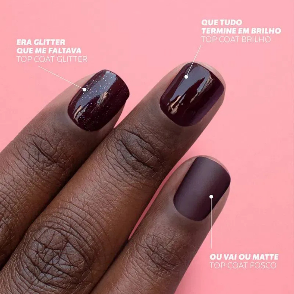 É do time mais é mais? Amigue, está aqui o brilho que faltava na sua esmaltação: o TOP COAT GLITTER! Esse verniz com pequenas partículas de glitter é um sonho: com efeito holográfico, entrega um brilho intenso à sua esmaltação. Como tem uma textura fininha, não acumula e você pode construir a intensidade de brilho do jeito que mais gosta, aplicando uma ou várias camadas de produto. Ah, e a tampinha roxa também ajuda a identificar a sua função de finalização. Na dúvida, brilhe!